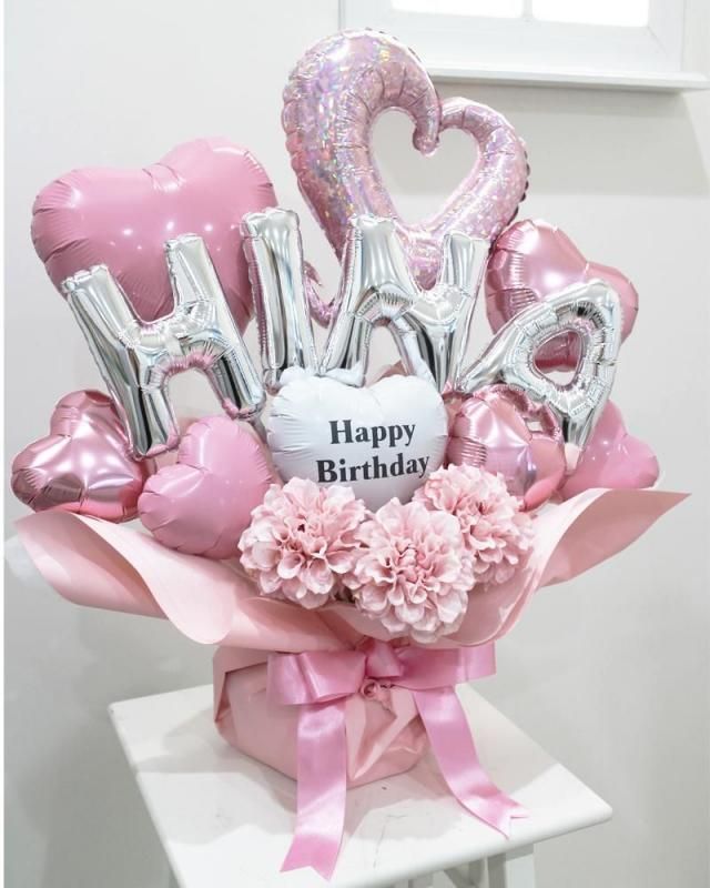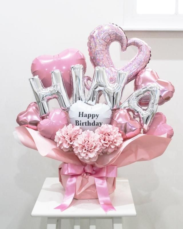 パステルピンクのハートバルーンとアーティシャルフラワーや文字バルーンを合わせたラブリーなアレンジメントです。