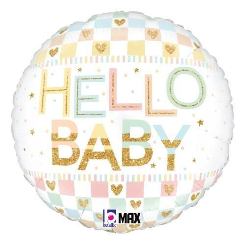 パステルカラーのHello baby! の文字がかわいい出産お祝い用バルーンです。サイズ : 膨らまし前 / 43cm 膨らませ後 / 32cm