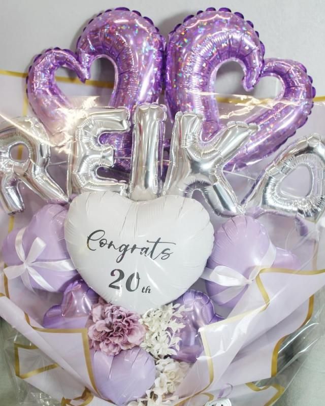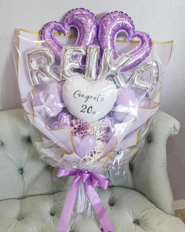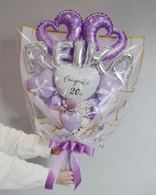 【バルーン】ダブルオープンハートフラワーバンチ ソフトラベンダー(花束タイプ)(文字バルーン入り) 成人式/卒業式/誕生日/発表会10,000円(税込11,000円)