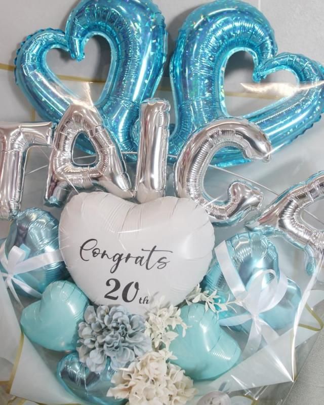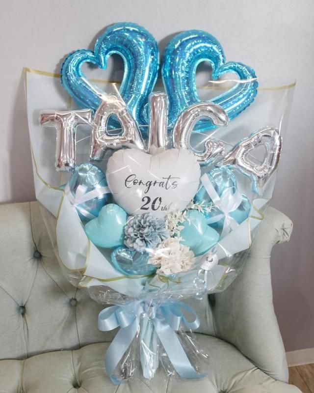 お誕生日、発表会、成人式、卒業式、入学式、母の日etc 色々なお祝い、プレゼント、パーティーなどに大人気の手持ちタイプのバルーンギフトです。ダブルオープンハート、シルバーのお名前の文字バルーン、アーティフィシャルフラワーを爽やかな水色カラーでまとめた、オシャレでかわいいデザインの手持ち花束タイプのバルーンブーケです★