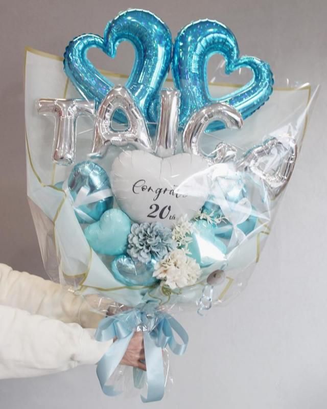 【バルーン】ダブルオープンハートフラワーバンチ パウダーブルー(花束タイプ)(文字バルーン入り) 成人式/卒業式/誕生日/発表会10,000円(税込11,000円)