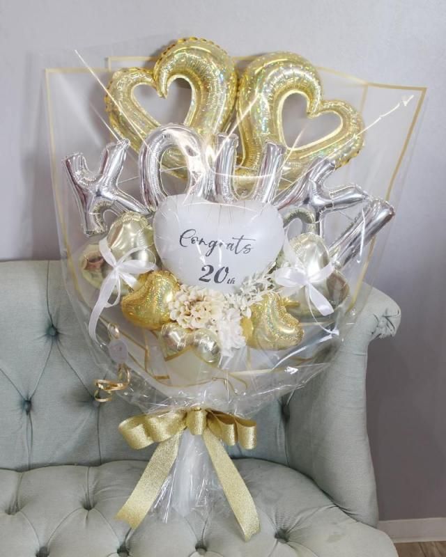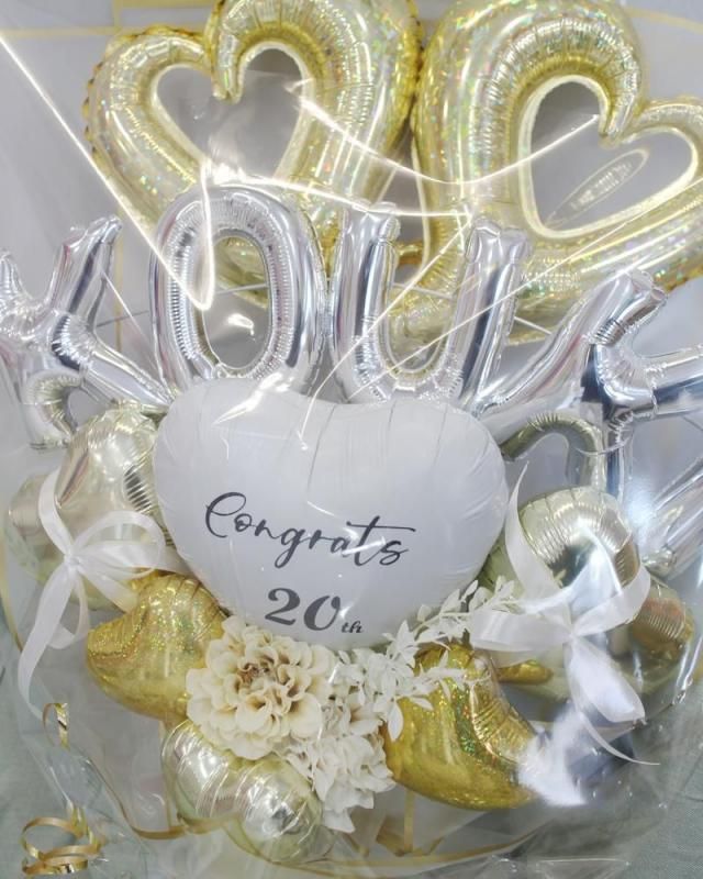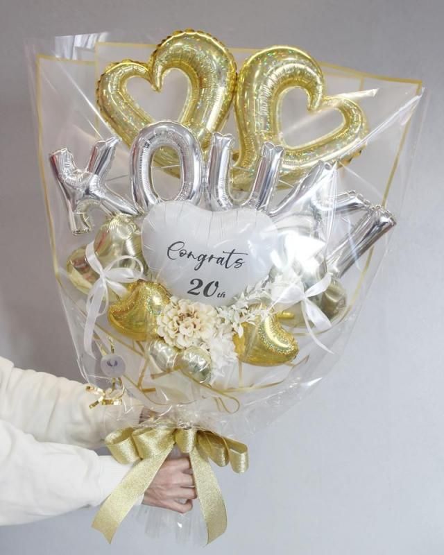 お誕生日、発表会、成人式、卒業式、入学式、母の日etc 色々なお祝い、プレゼント、パーティーなどに大人気の手持ちタイプのバルーンギフトです。ダブルオープンハート、シルバーのお名前の文字バルーン、アーティフィシャルフラワーを華やかなシャンパンゴールドカラーでまとめた、オシャレでかわいいデザインの手持ち花束タイプのバルーンブーケです★