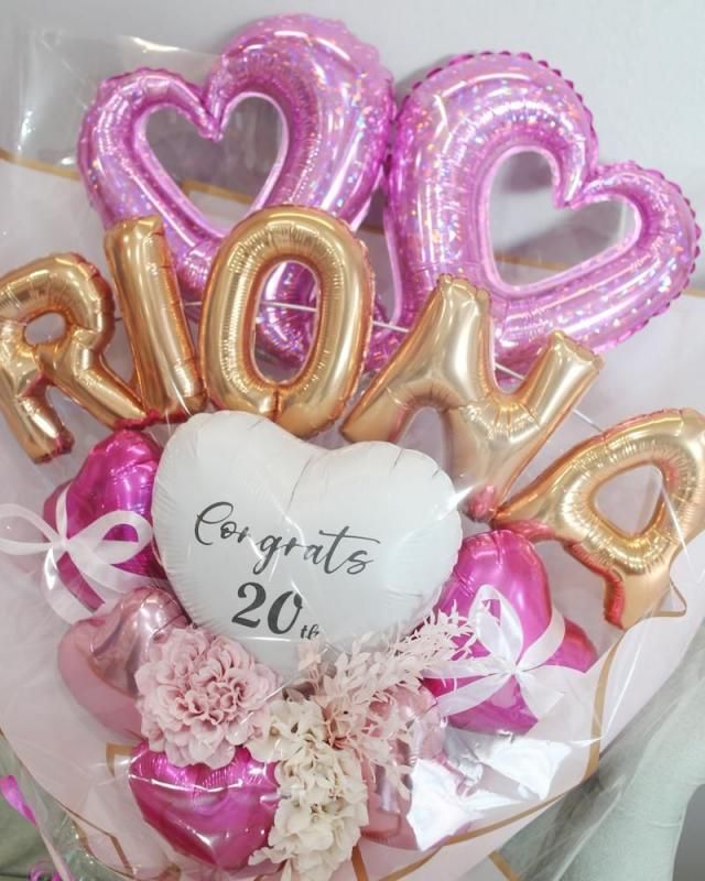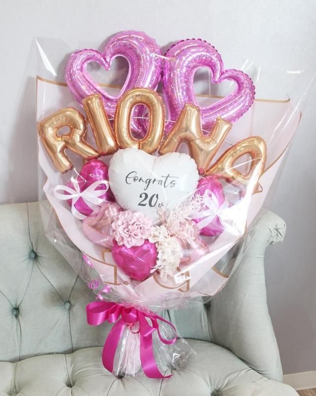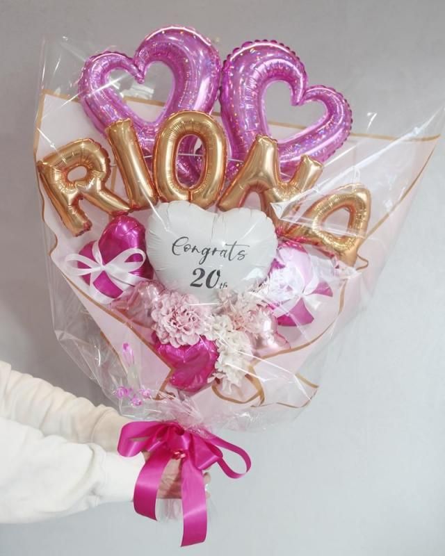お誕生日、発表会、成人式、卒業式、入学式、母の日etc 色々なお祝い、プレゼント、パーティーなどに大人気の手持ちタイプのバルーンギフトです。ダブルオープンハート、ゴールドのお名前の文字バルーン、アーティフィシャルフラワーをビビットなピンクカラーでまとめた、オシャレでかわいいデザインの手持ち花束タイプのバルーンブーケです★