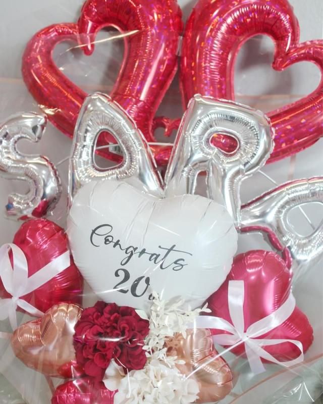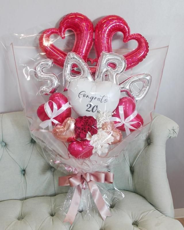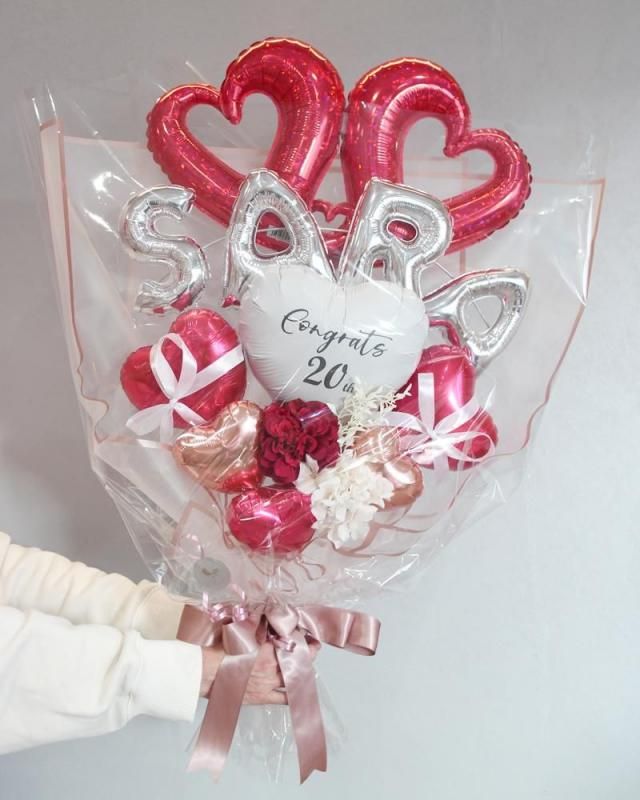 お誕生日、発表会、成人式、卒業式、入学式、母の日etc 色々なお祝い、プレゼント、パーティーなどに大人気の手持ちタイプのバルーンギフトです。ダブルオープンハート、シルバーのお名前の文字バルーン、アーティフィシャルフラワーを鮮やかなレッドカラーでまとめた、オシャレでかわいいデザインの手持ち花束タイプのバルーンブーケです★